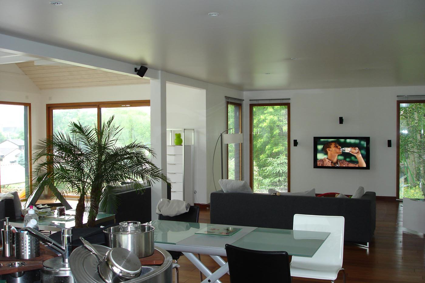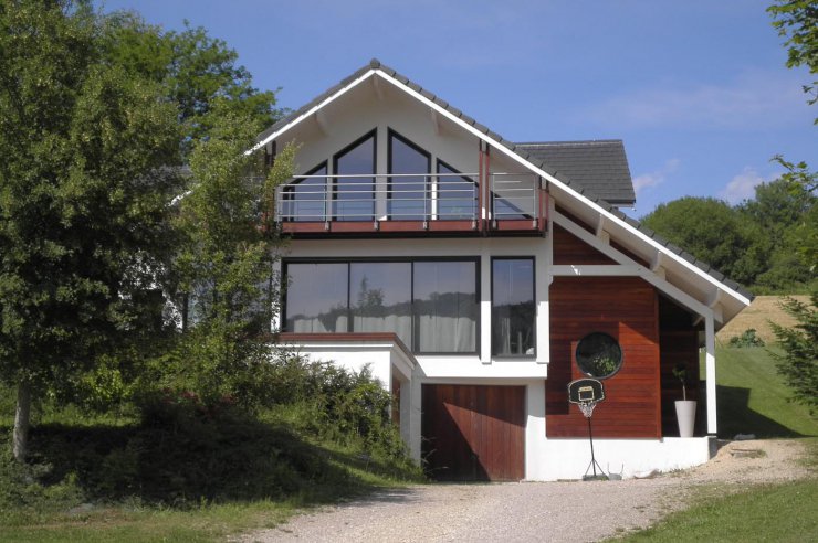 Maison contemporaine très lumineuse dotée d'une conception poteaux poutres et structure bois permettant ainsi d'ouvrir les espaces. Une réalisation bioclimatique avec des débords de toit importants protégeant du soleil en été mais laissant pénétrer le rayonnement solaire en hiver.